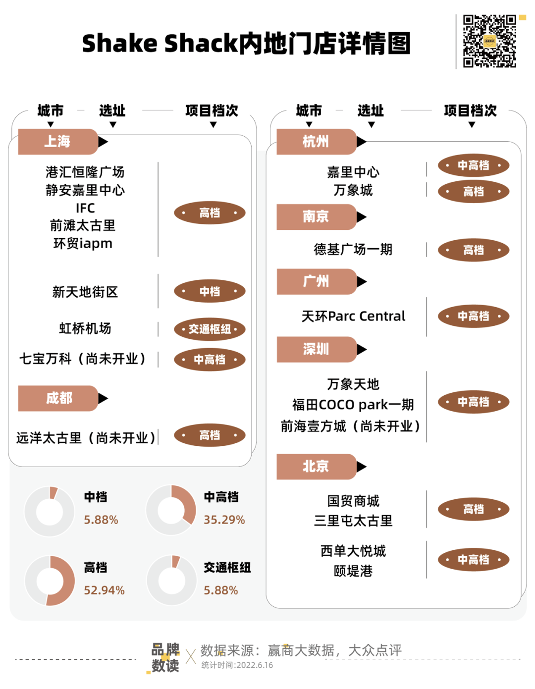 具体而言,Shake Shack内地市场已开业的17个项目中,入驻高档购物中心的门店超过半数,达52.93%,而入驻中高档购物中心的门店占比为35.29%。