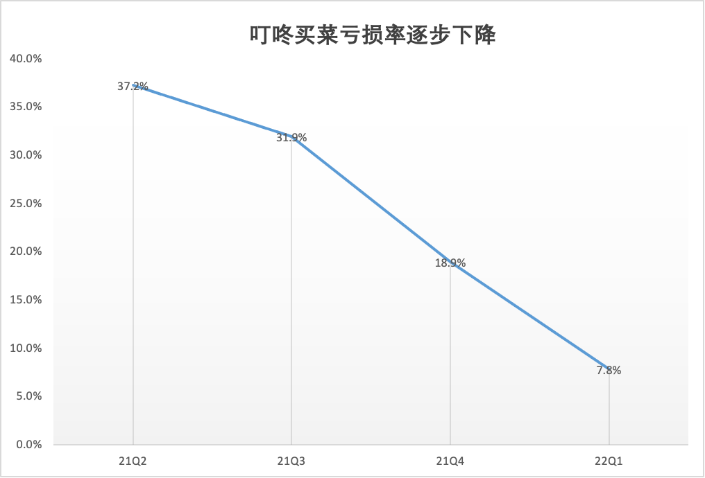 几天前,叮咚买菜发布的2022年Q1财报有一个很大亮点:亏损率从2021年Q2的37.2%一路收窄至7.8%,连续四季度减亏趋势状似一根鲜明的抛物线。
