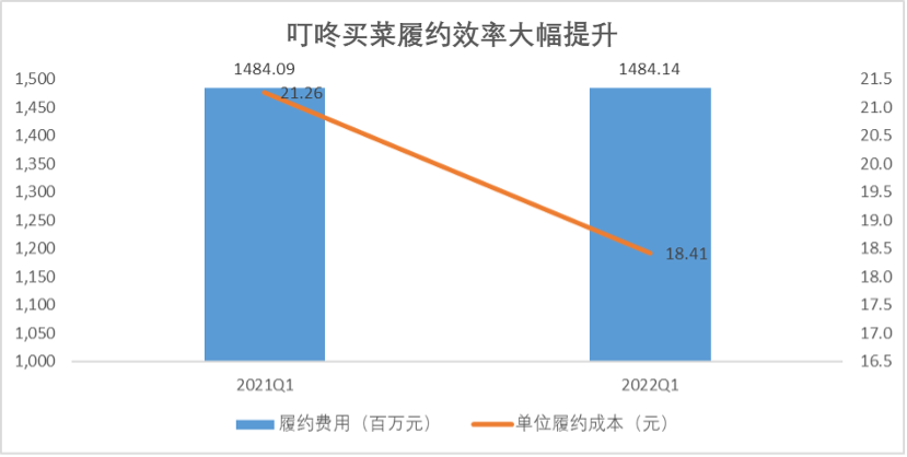 值得一提的是,订单数量大涨,但本季叮咚买菜的履约费用却几乎没有增长。14.84142亿元的履约费用和去年同期的14.84091亿元持平。每笔订单的履约成本则从2021年Q1的21.26元下降13.4%至本季度的18.41元。