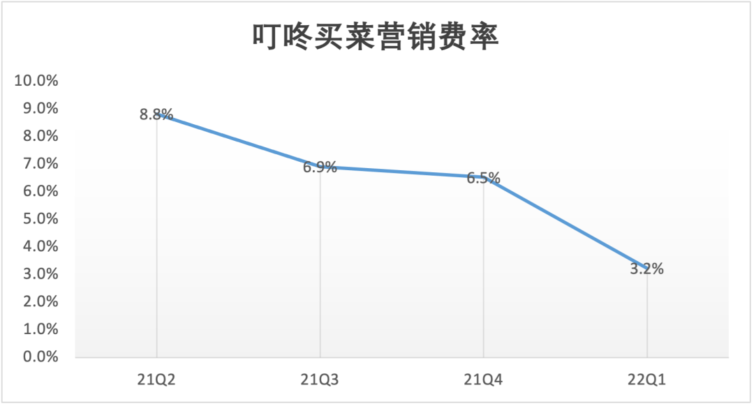 Q1财报显示,营销费用下降,但截至2022年3月31日,叮咚买菜一季度GMV58.513亿元,较上年同期43.035亿元增长36.0%。其中,订单总数达8060万,较上年同期6980万增长15.6%。