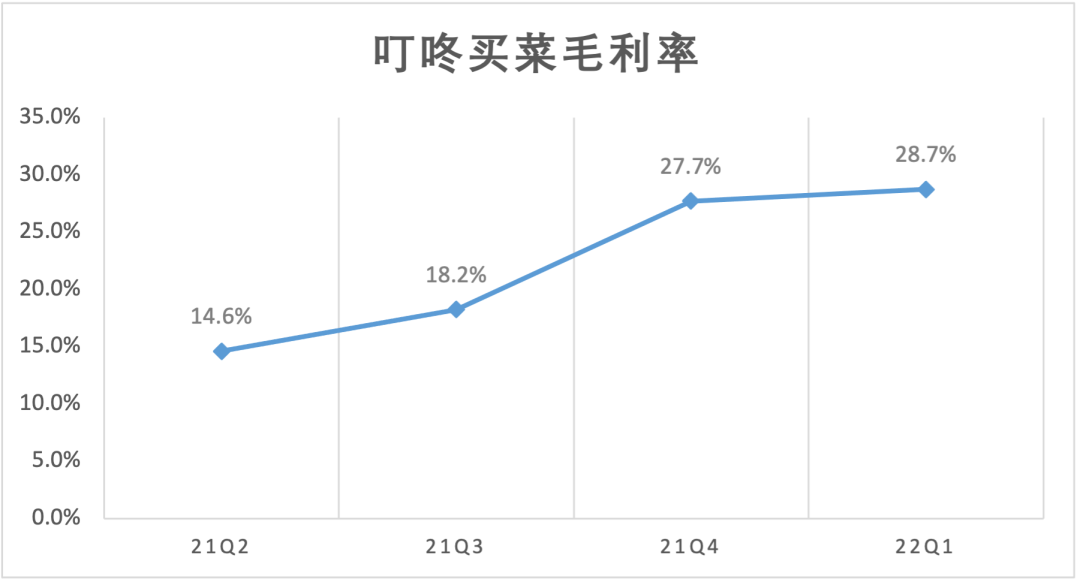 Q1 叮咚买菜毛利率为28.7%,较2021年同季度18.9%有明显改善。