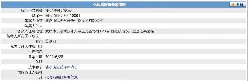 N-乙酰神经氨酸(又名“SA”、“燕窝素”、“唾液酸”),是“燕窝酸”的化学名称,在2021年6月29日,由武汉中科光谷绿色生物技术有限公司(注:嘉必优生物技术股份有限公司的全资子公司)注册备案完成,成为新规施行后首批备案成功的化妆品 “001号新原料”。