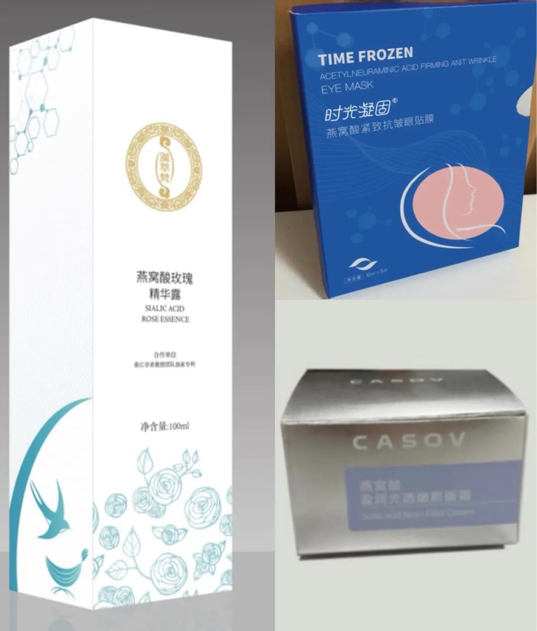 除了自然堂,目前市面上应用了该成分的还有:时光凝固燕窝酸紧致抗皱眼贴膜、CASOV燕窝酸盈润光头嫩颜面霜、汉萃梵燕窝酸玫瑰面膜等,都是近半年内完成的药监局备案。