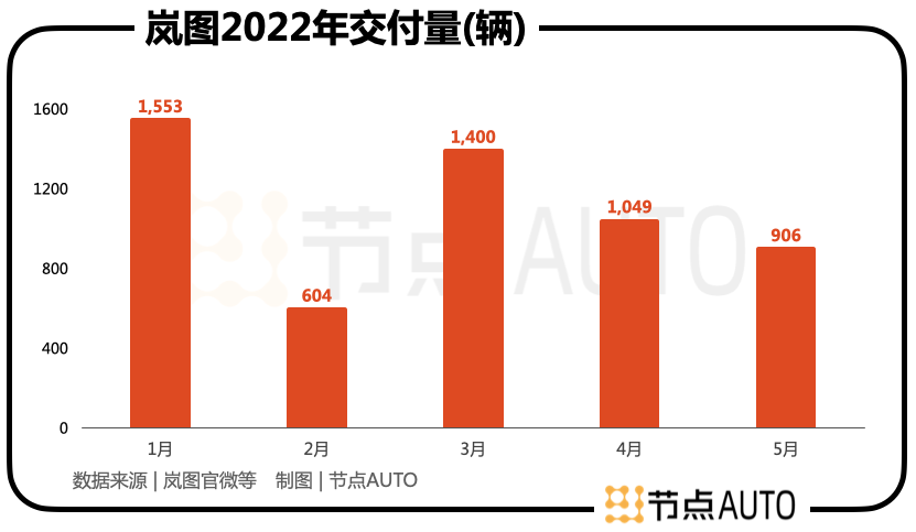数据显示,2022年1月,岚图交付1553辆,而当月产量为3435辆,销量明显不及预期;2月则干脆大腰斩,销量仅为604辆;3月回暖到千量以上。4月、5月,又掉头缩了回去……