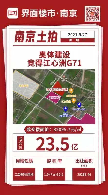 该项目于去年9月27日被奥体新城以总价23.5亿元拿下,楼面价32096元/㎡,毛坯限价42850元/㎡。当时江心洲G71地块作为开发商报名最多的热门地块之一(约15家),经过27轮竞价,仅5分钟便触顶最高限价,并且当时的出让条件明确要求,该项目不得合作开发。