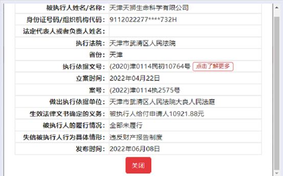 最近的一则信息显示,今年6月,天狮集团大股东天狮生命科学有限公司被列为失信被执行人,生效法律文书确定的义务为:被执行人给付申请人10921.88元。