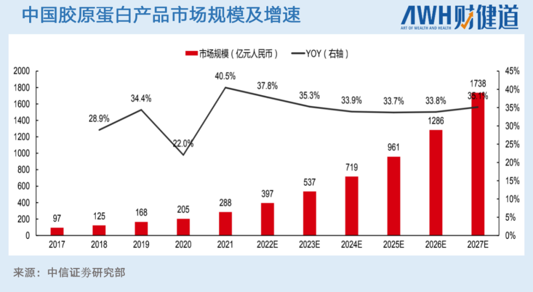 弗若斯特沙利文相关数据显示,我国胶原蛋白产品市场零售额由2017年的97亿元提升至2021年的288亿元,年复合增速达到35%。