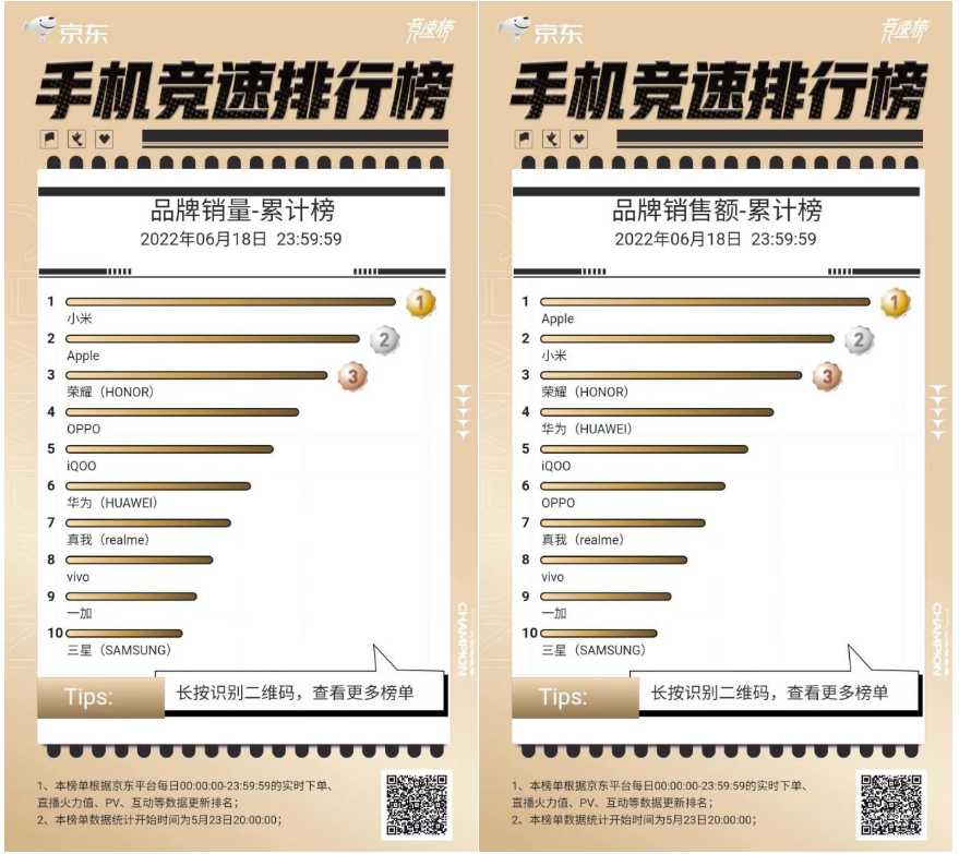 以大热的手机通讯为例,京东手机竞速排行榜显示,截至6月18日23:59:59,小米、Apple、荣耀销量位列排行榜前三甲,从销售金额来看,Apple超过小米排在第一,荣耀稳居第三。