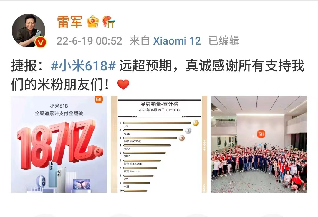 以京东上手机销冠品牌小米为例,今年618后,雷军零点发文庆祝,小米618全渠道累计支付金额突破187亿元,并表示“远超预期”。但其实小米今年618销售额不如去年。