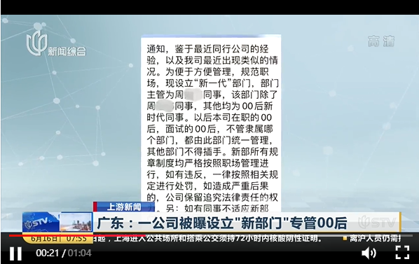 近日有新闻报道称,广东某公司反向成立了“新一代部门”,专门用来管治00后,其中要求公司新入职的00后员工,不管隶属于哪个部门,都由此部门统一管理,其他部门不得插手。