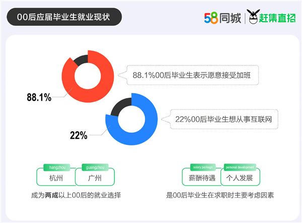 但根据58同城、赶集直招发布的《2022年毕业季调研分析报告》显示,“愿意加班”的00后仍然占据多数,比例高达88.1%,其中29.1%的毕业生认为加班可以多学点东西,40.5%认为有利于个人发展,20.6%因“热爱这份工作”而加班。
