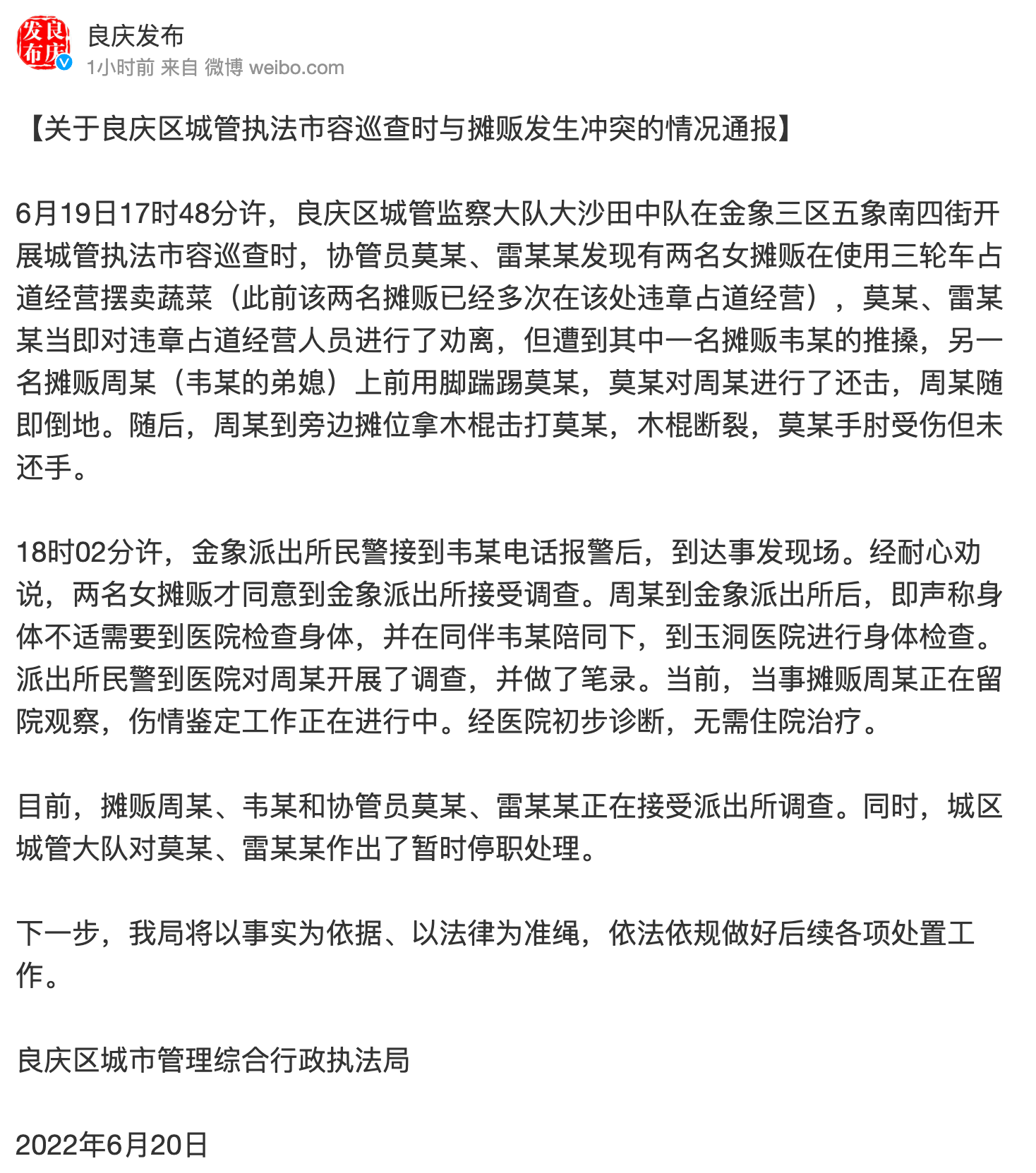 据@良庆发布 微博消息,良庆区城市管理综合行政执法局6月20日发布情况通报称,6月19日17时48分许,良庆区城管监察大队大沙田中队在金象三区五象南四街开展城管执法市容巡查时,协管员莫某、雷某某发现有两名女摊贩在使用三轮车占道经营摆卖蔬菜(此前该两名摊贩已经多次在该处违章占道经营),莫某、雷某某当即对违章占道经营人员进行了劝离,但遭到其中一名摊贩韦某的推搡,另一名摊贩周某(韦某的弟媳)上前用脚踹踢莫某,莫某对周某进行了还击,周某随即倒地。随后,周某到旁边摊位拿木棍击打莫某,木棍断裂,莫某手肘受伤但未还手。