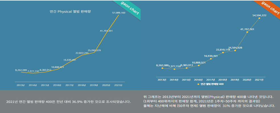 据韩国Gaon Chart排行榜数据统计,2021年韩国实体专辑销量大盘一路高飞,与2020年相比增加了36.9%。其中,占据排名前400位的实体专辑销量总和更是达到约5800万张,同比2020年增长31%。直白一点来说,即2021年全年实体专辑销量是2015年到2018年实体专辑销售量的总和。