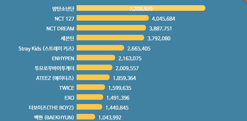 从2021年Gaon Chart专辑总销量记录来看,累计720万左右的BTS依旧断层领跑,在“廉价盘效应”下的第二梯队男团NCT 127、NCT DREAM各以404万和388万左右的销量居于其下,SEVENTEEN也以379万张左右的销量紧随其后。而在2021年以前从未到达过百万门槛的Stray Kids、ENHYPEN、TXT等组合,更是借廉价盘销量激增至100万至300万区间浮动。
