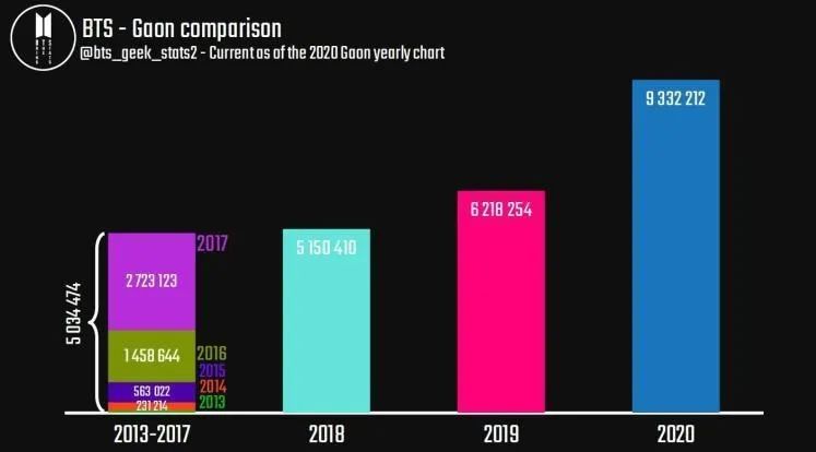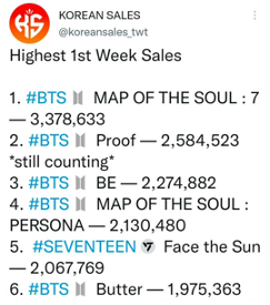 毕竟,销量意味着卖座,也意味着人气,这与演唱会、广告代言等其他营收渠道也息息相关。以BTS来说,其连续五年为销量年冠,单张专辑销量在200万张以上为基操。而200万张对于其他艺人来说,无疑是一座大山。