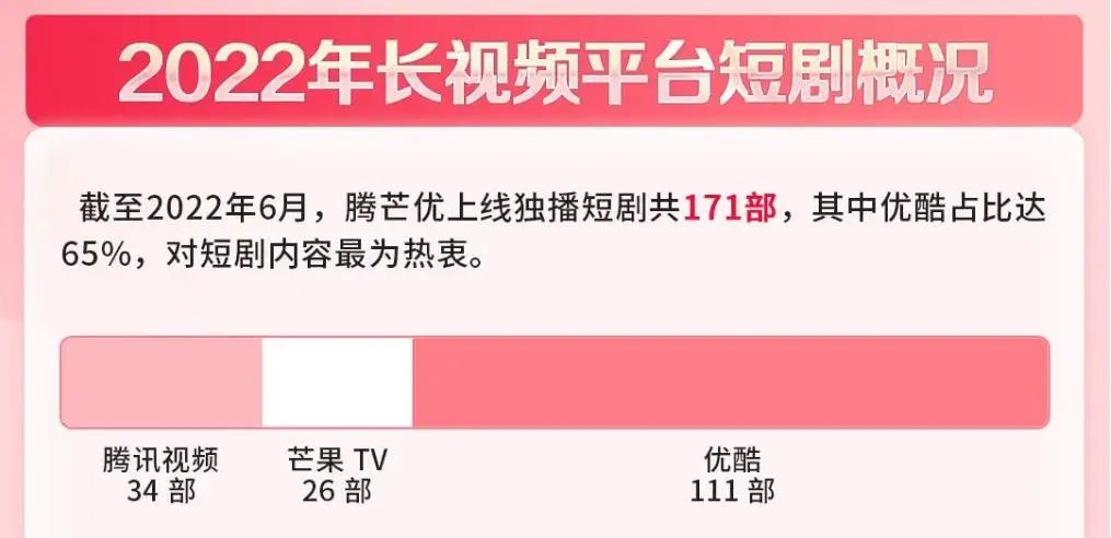 从2021年起,各大主流平台纷纷设立短剧剧场。据相关数据显示,在2020年,微短剧上新的数量为300部,到2021年这一数字已经达到了471部,上升171%。而到了2022年,截至今年6月份,不算短视频播出的短剧,光是在腾优芒三大平台上线独播的短剧便已经有171部。