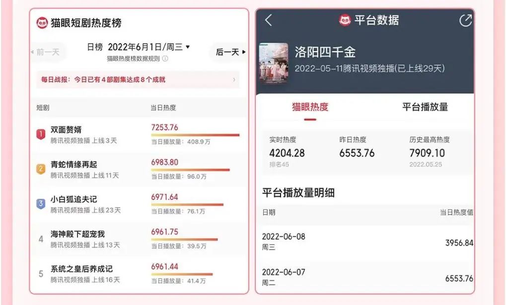 6月20日,在猫眼专业版的最新版本中,首度上新短剧热度榜。这不仅代表了当前微短剧领域的蓬勃发展,走向常态化、规范化,同时也给用户提供了更进一步了解微短剧的平台。