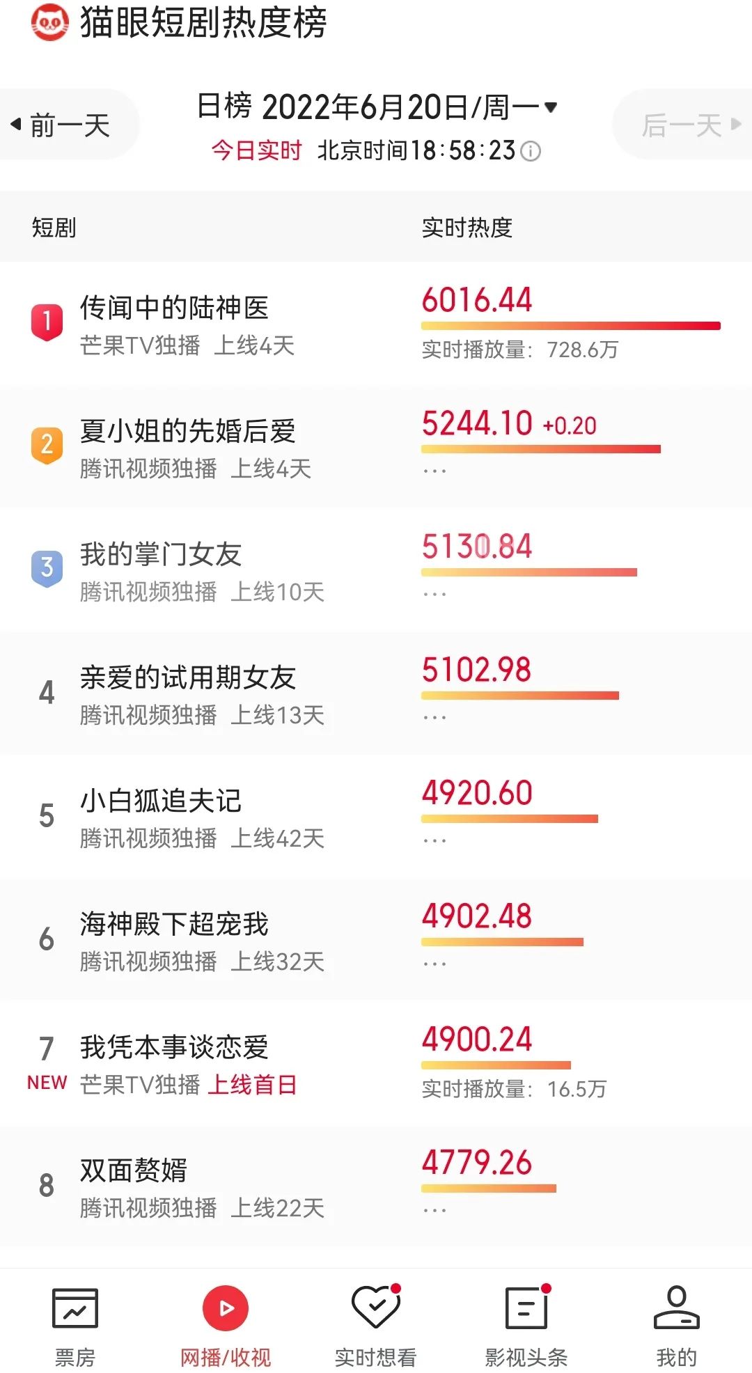在榜单中,当前位居榜首的是芒果TV上线不久的《传闻中的陆神医》,其次主要是来自腾讯视频的独播短剧,从《亲爱的试用期女友》到《夏小姐的先婚后爱》等一系列微短剧。