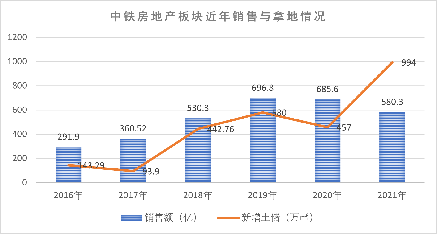 2021年,虽然全年在京沪等热门城市抢收地块,实现新增土储翻番,但受行业调整影响,中铁系地产销售额为580亿元,不仅同比下降15%,也远不如早已步入千亿地产阵营的中铁建地产。
