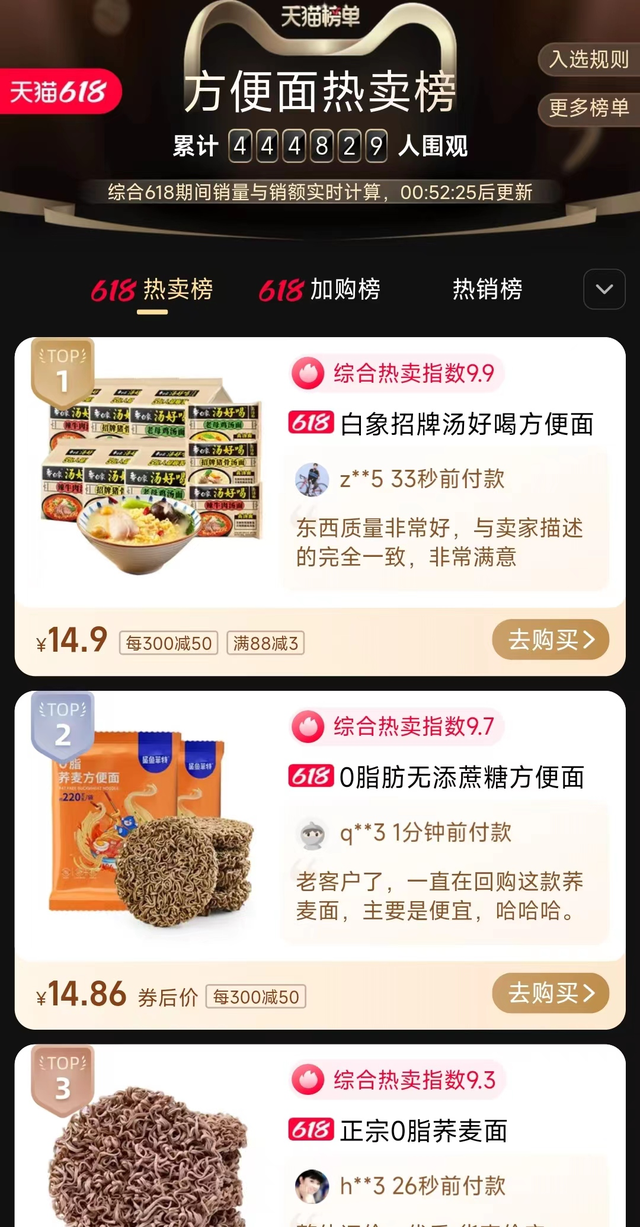 今年618,方便面这款日常热销的美食没有太多热点,只有天猫发布了618方便面销售排行榜TOP5。