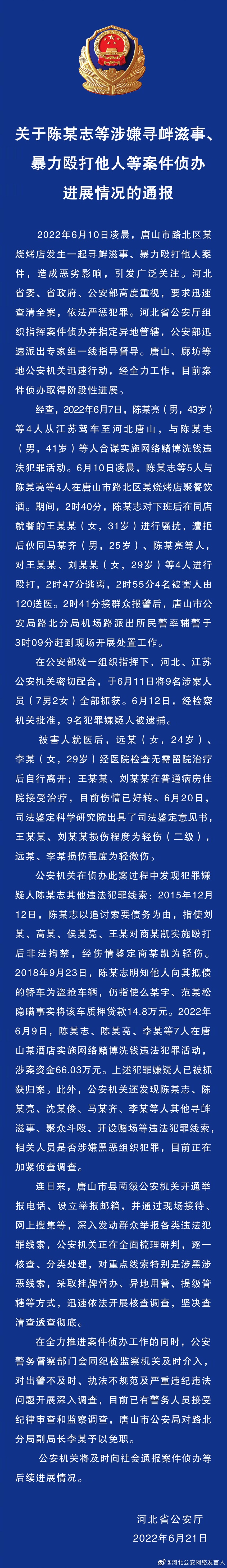 @河北公安网络发言人 6月21日消息,河北省公安厅发布关于陈某志等涉嫌寻衅滋事、暴力殴打他人等案件侦办进展情况的通报。
