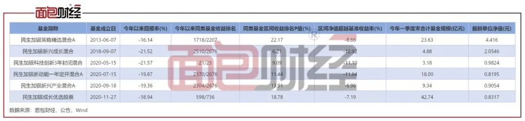 其中,金牛奖基金民生加银策略精选混合年内收益率在同类基金中排名靠后;规模最大的民生加银成长优选股票的单位净值跌至0.84元以下。另外,多个在2020年发行的产品,目前基金单位净值跌至不足1元。