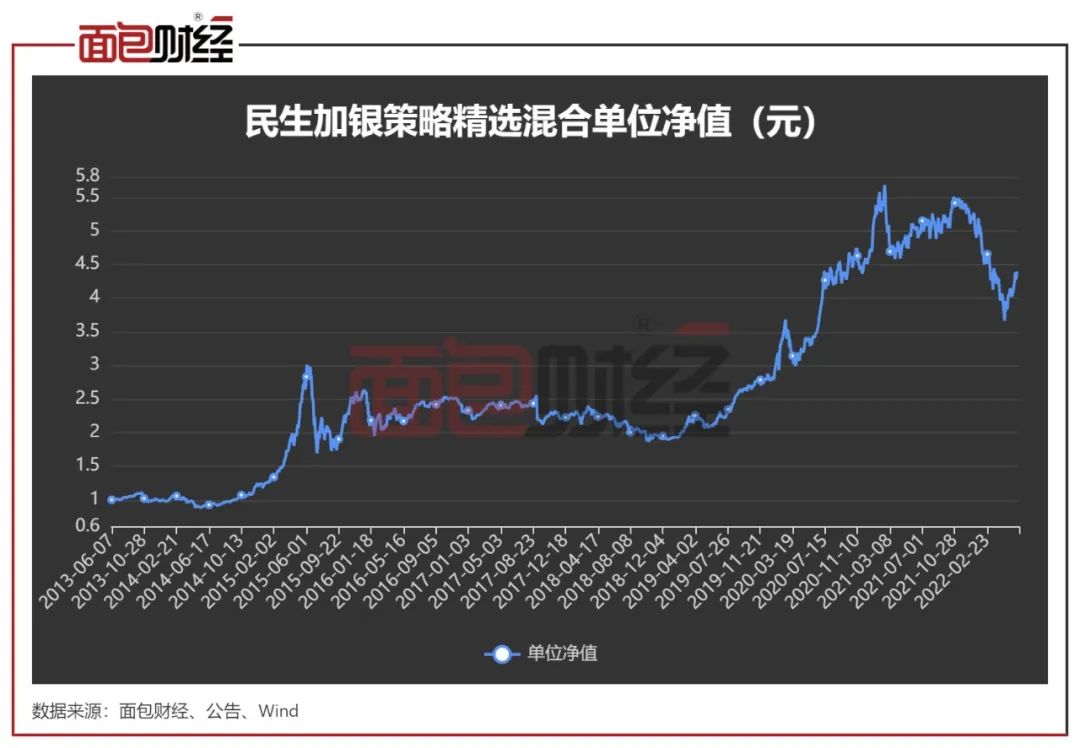 民生加银策略精选混合成立于2013年,成立初期业绩表现一般,直到2014年7月孙伟接管该产品后,基金单位净值显著提升,从0.8元最高达到2021年年初的5.68元。