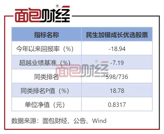 基金进入稳定运营后,业绩表现并不乐观。截至2022年6月17日,民生加银成长优选股票的单位净值仅约0.83元,年内回撤18.94%,在736只普通股票型基金中排名598位,跑输业绩基准逾7个百分点。