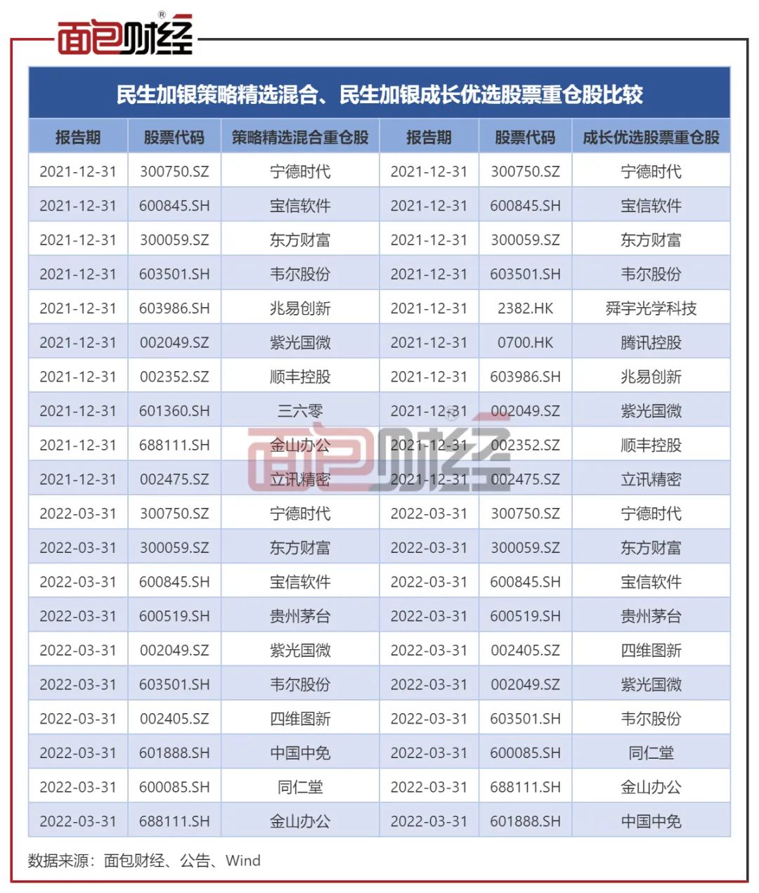 图6:近2个季度民生加银策略精选混合、民生加银成长优选股票重仓股比较