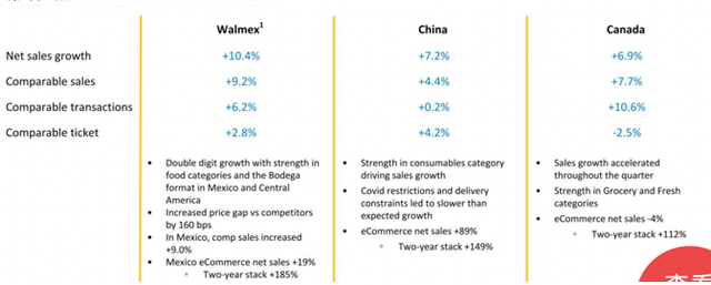 根据沃尔玛公布的2022年一季报,第一季度,沃尔玛中国的净销售额同比增长7.2%;可比(至少开一年)销售额同比增长4.4%,其中,可比销售交易量同比增长0.2%,远低于“墨西哥及中美洲国家”和加拿大6.2%和10.6%的增速。