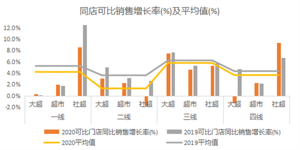 我国超市业态主要是大型超市 + 超市 + 社区超市的格局,仅看大型超市,一线城市在疫情发生前也几乎没有增长;二线大型超市受疫情影响出现滑坡;三线城市是少有的亮点,依然保持超6%的增长;四线的大型超市直接负增长。