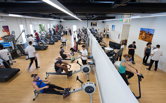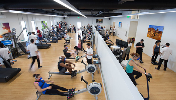走进最大的一个房间:墙上贴着激励性的照片,近 20 个志愿者跟着音乐的鼓点在跑步机、自行车、椭圆机、划船机等健身器材上大汗漓淋……如果非要跟健身房找出一点什么不同,那就是每个健身志愿者都佩戴着呼吸面罩。