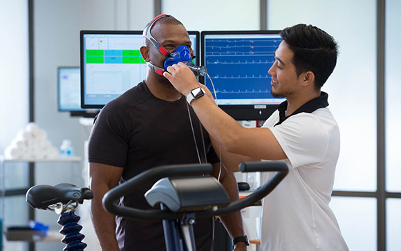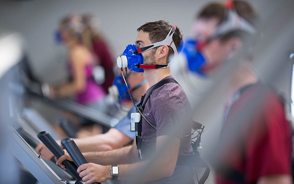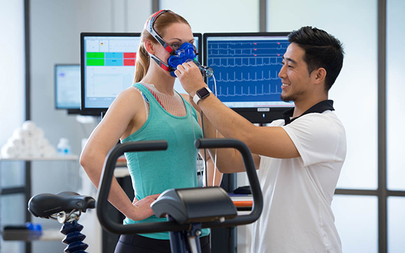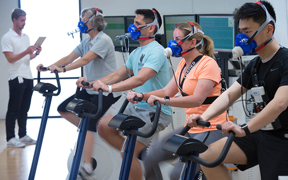 他的身边,驻足着一名身着白色上衣的生理学家和一名身穿黑色上衣的护士,他们手持 iPad,时刻监测来自呼吸面罩的数据,时不时对他们进行指导和调整。