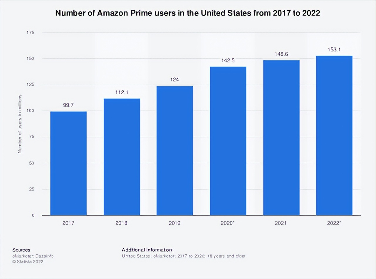 从 2019 年到 2021 年,亚马逊的收入增长了 67%。在同一时期,其在美国的主要用户从 1.24 亿增长到约 1.49 亿。预计这一趋势将持续到 2022 年底,美国主要用户数量预计将达到约 1.53 亿消费者。
