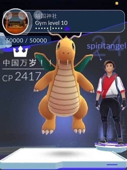 7月22日,《Pokemon GO》终于在日本开服了,然而很快一位中国玩家就发布了一张照片,显示自己已经占领了游戏中的“道馆”靖国神社,并且还将自己的宠物快龙改名为“中国万岁!!!”。