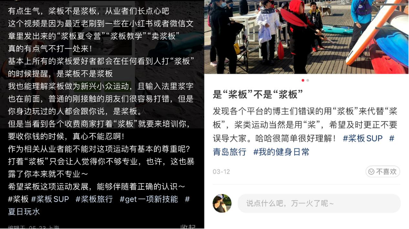 不过目前大众对桨板的认知还不算高,甚至连这个名字也会写错——小红书有些笔记会把桨板写成“浆板”,还会有人专门发笔记纠正。