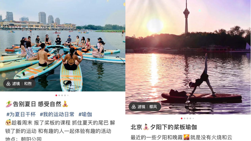 各大平台上,达人网红们或穿着泳衣,或瑜伽裤,或运动短裙,摆出相应的架势,蓝天碧水的氛围烘托下,一张张融合了活力、自然、专业、极限等特点的照片,吸引了更多路人加入体验。