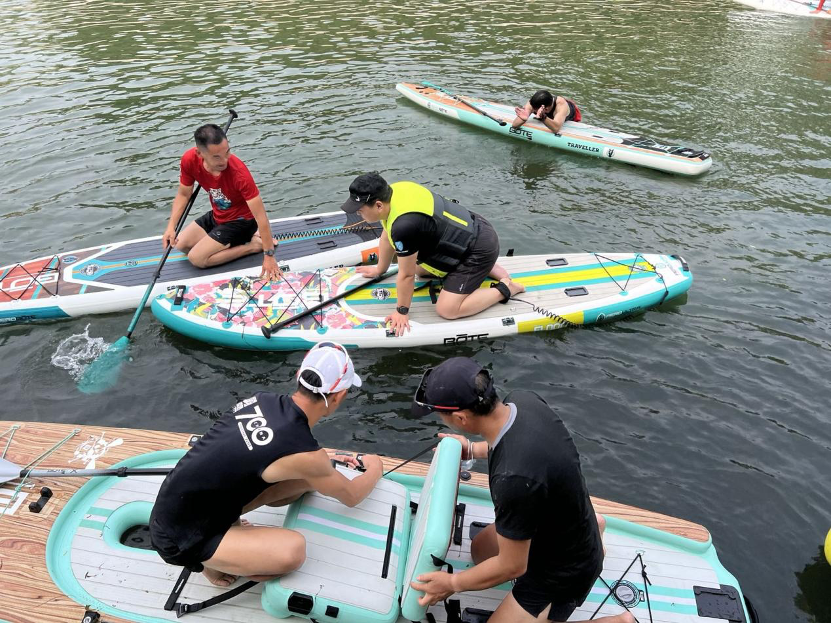 教练多是专业的水上运动教练,或是常年玩户外的人士。比如俱乐部的安全官“龙教练”,本职就是专业游泳教练。即使是刚体验桨板活动的新用户,教练也会首先教会大家如何在落水时自救,这也是在玩桨板时最重要的一点安全教育。