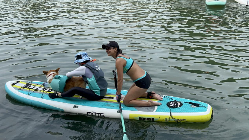 桨板这项水上运动,门槛不高,“而且穿着救生衣,不会游泳也可以玩。”“适合亲子、带娃。”小红书的笔记多是这样去形容桨板。而且桨板可以一个人划,也可以两个人划;可以站着划,也可以跪着、坐着、趴着划;可以在桨板上做瑜伽、倒立,也能带上自己的小柯基,安静地坐在桨板上,从水上看世界。