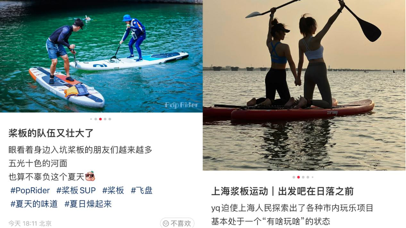 “桨板和夏天锁死”“最潮流的水上运动”“桨板上瘾”,社交媒体上不乏很多关于桨板的讨论。截止到6月20日,小红书上关于桨板的笔记已经有两万多篇,相关推荐词条还包括桨板推荐、桨板教学、桨板穿搭等。