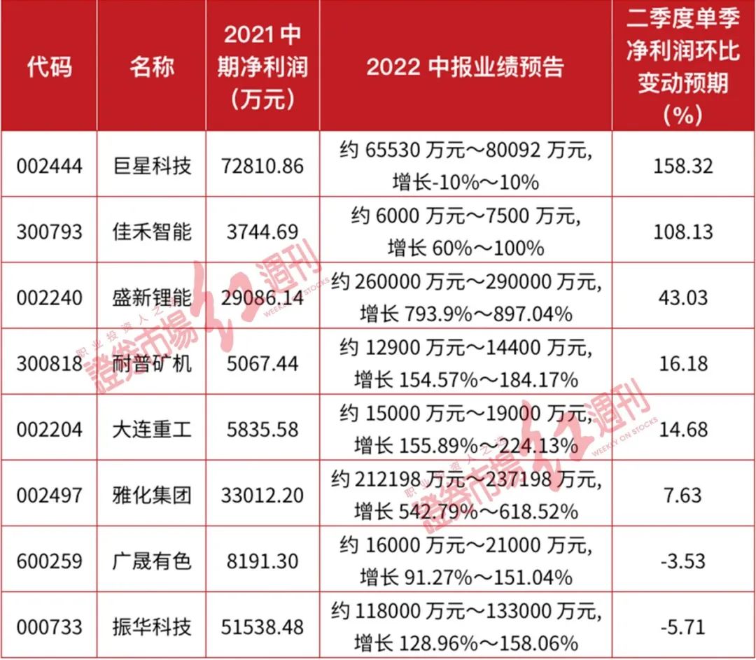 与上述业绩表现不佳公司相比,盛新锂能、雅化集团、大连重工、耐普矿机、振华科技、广晟有色、嘉合智能等公司则相继预告上半年净利润将完成增长,且预增幅度均有望翻倍。