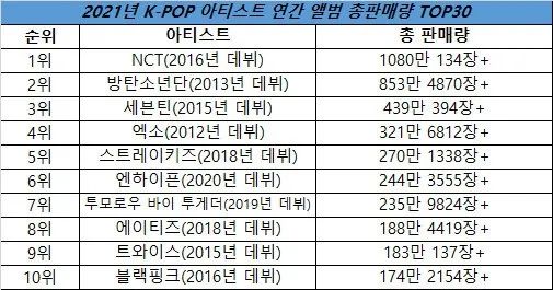 而综合HYBE、SM娱乐、JYP娱乐、YG娱乐去年的财报来看,不管是专辑营收还是歌曲音源,如果忽略防弹少年团占据的一骑绝尘的地位,HYBE旗下其他男团与SM娱乐旗下男团竞争力也较强,与JYP娱乐旗下Stray Kids几乎占领2021年专辑销量前十席位。