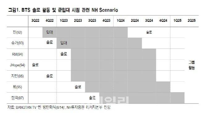 虽然根据2020年修订的《兵役法》显示,防弹少年团获得花冠文化勋章可以延长两年入伍期限,但年纪最大的成员JIN(1992年生)也必须在今年年底入伍。另据韩国NH证券预测,其余成员也将在2023年四个季度分批入伍,2025年第二季度则可以全员退伍展开团体活动。