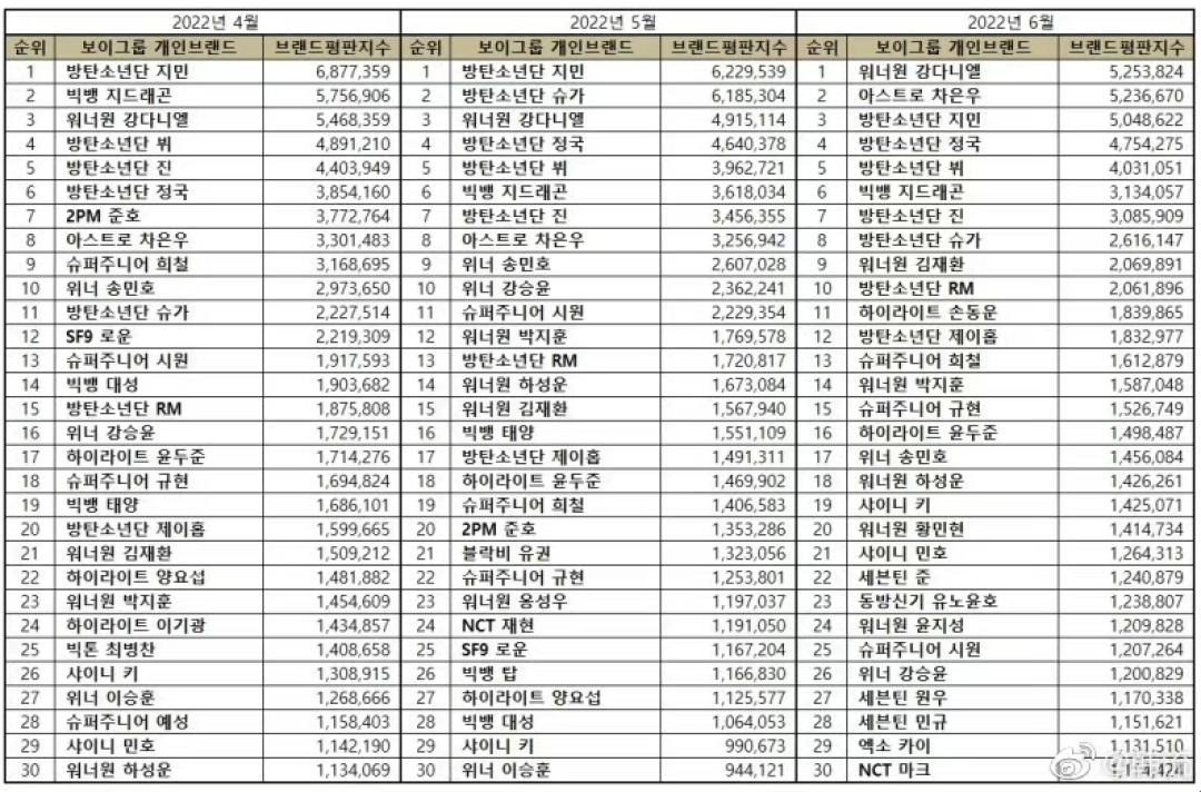 根据韩国企业评价研究所公开的2022年6月月度男艺人品牌榜单数据显示,成员JIMIN、JUNGKOOK、V对比往期仍然长久占据前五位置,偶有与姜丹尼尔、车银优分庭抗礼。其余成员则依旧在中上游浮动,这其中,J-HOPE时常为团中个人品牌垫底。比起其他成员,也就不难理解为何J-HOPE率先打出个人品牌。