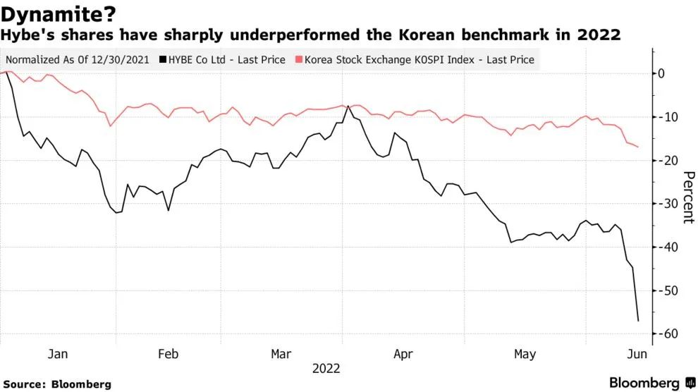 据彭博社消息,在防弹少年团宣布暂停活动的6月14日当晚,HYBE市值就蒸发了近2万亿韩元,关于防弹少年团实为解散的猜测也遍布全球。6月15日,也就是防弹少年团宣布暂停活动后的第二天,HYBE收盘价比上个交易日暴跌24.87%,创下52周以来最低水平。而其股价今年以来已累计下跌60%,明显低于韩国基准指数。