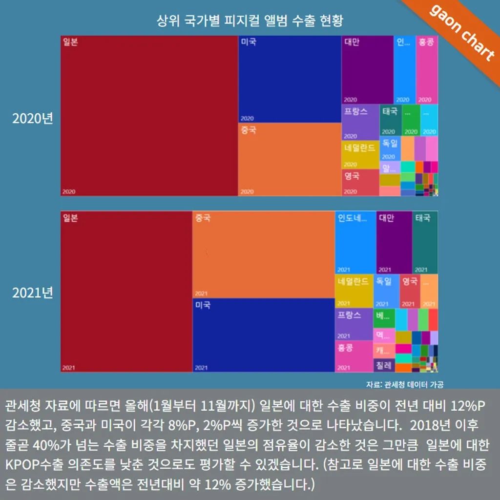 值得注意的是,随着防弹少年团打开以美国为主的海外市场,根据Gaon Chart数据显示,去年K-Pop专辑对外出口比例波动较大,主要体现在对日本市场依赖有所下降,在中国及美国市场分别增长了8%和2%。