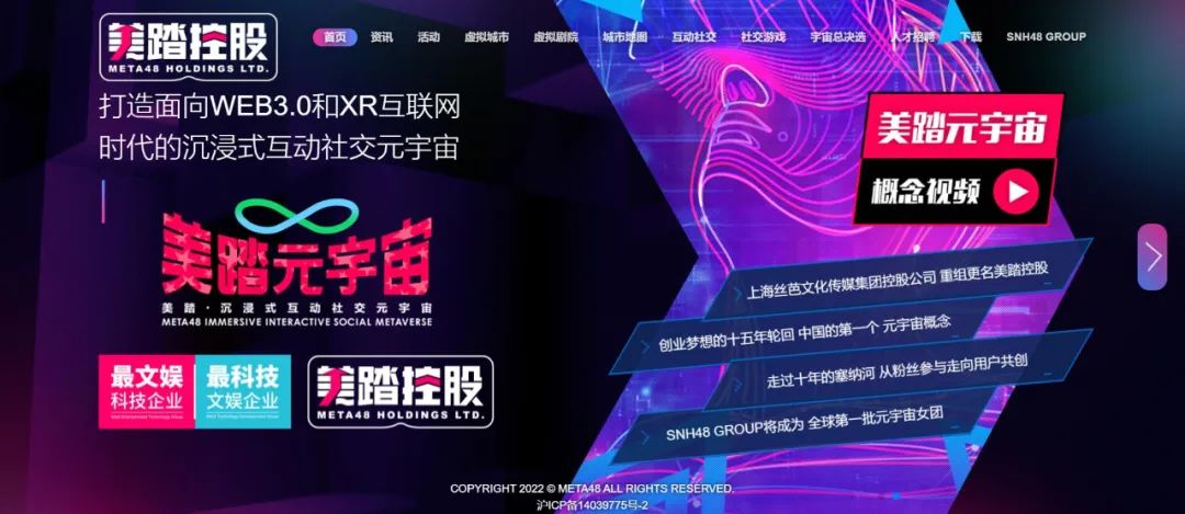 6月10日,国内偶像女团SNH48 GROUP的运营方丝芭传媒宣布重组核心业务和企业构架,其控股公司也更名为美踏控股,核心业务也将转型为面向WEB3.0和XR互联网时代的沉浸式互动社交元宇宙——美踏元宇宙。