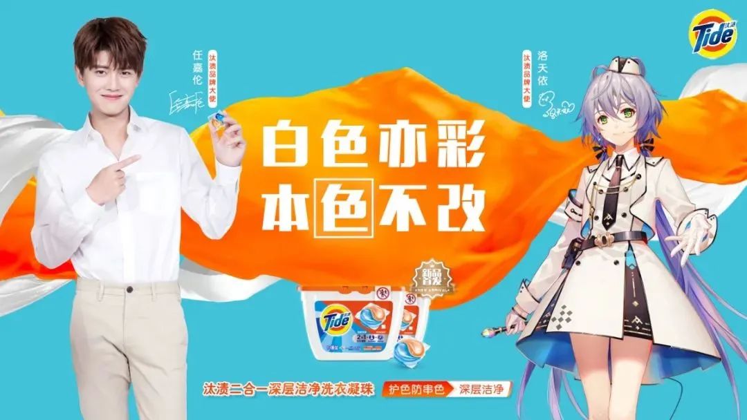 代言,是衡量商业价值的标准,这在虚拟偶像身上也同样适用。国内二次元虚拟歌姬洛天依,凭借极高的知名度和粉丝基础,活跃在各大品牌的商业活动中,代言更是拿到手软,百雀羚、肯德基、光明、浦发银行、必胜客等几乎都有洛天依的身影,其所带来的商业价值也有目共睹,2020年汰渍发起的“汰渍破次元直播”中,洛天依首次亮相直播间,活动当天上线仅4个小时,微博阅读量就突破1亿,京东直播间的互动超过6000万,使得汰渍销量再创新高。