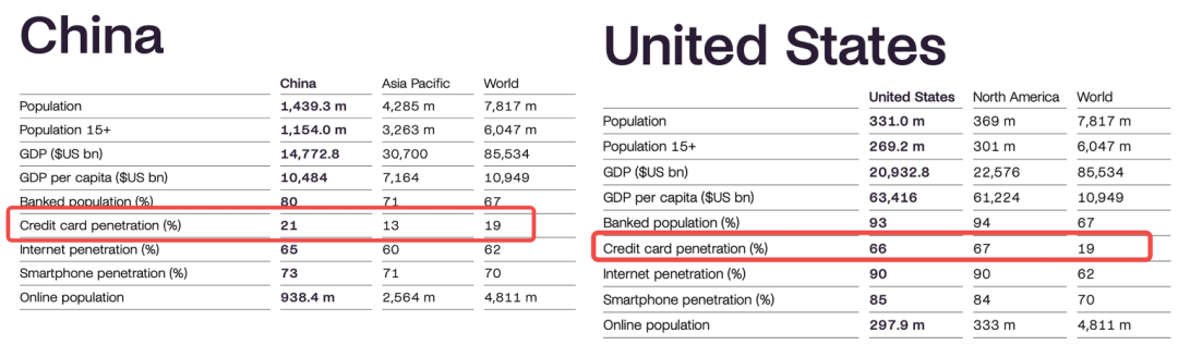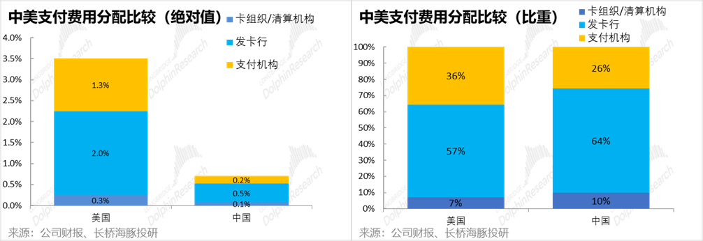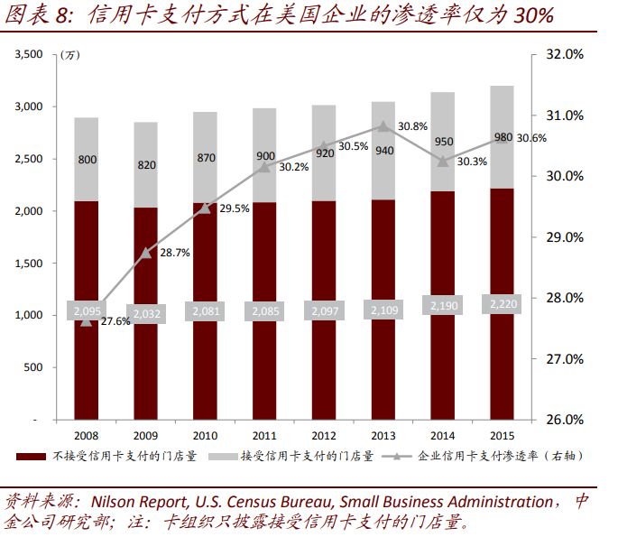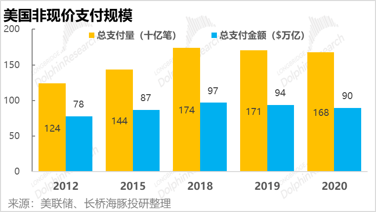 1)在数字支付兴起前,美国的银行卡渗透率远超中国,线下银行卡支付已相当成熟。因此, 中国由现金支付跨越式迈向数字支付时,居民支付体验的改善是明显的。但数字支付相对银行卡支付的改善相对有限,因此美国居民广泛由银行卡转向数字支付的动力不足。