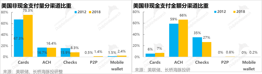 而按支付金额比重来看,ACH和支票则合计占比93%,银行卡占约7%,移动钱包则可忽略不计。从上述数据我们可以构建出以下情景,美国居民在日常小额支付中,银行卡是绝对首选;而在进行大额支付时则以银行转账和支票为主。P2P和移动钱包仅在少数小额支付情境下被使用。